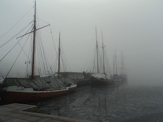 Very atmospheric down beside the water yesterday morning and felt like being in a black and white Victorian postcard, so quiet and misty. The boats have their Winter coats on to protect them from the snow and looked almost spooky in the fog. There was a light coating of ice on the fjord which made a lovely crackly pattern, whooshing about..